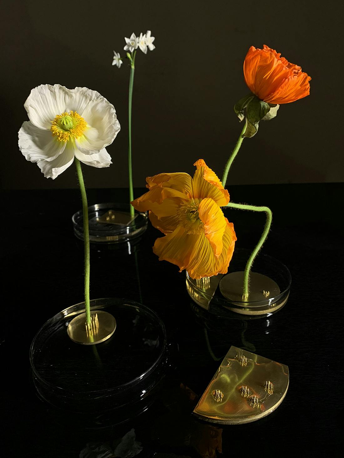 The flowers are fixed on brass needle clusters. The brass releases copper ions that reduce bacterial contamination of the water and help maintain the flowers stems.